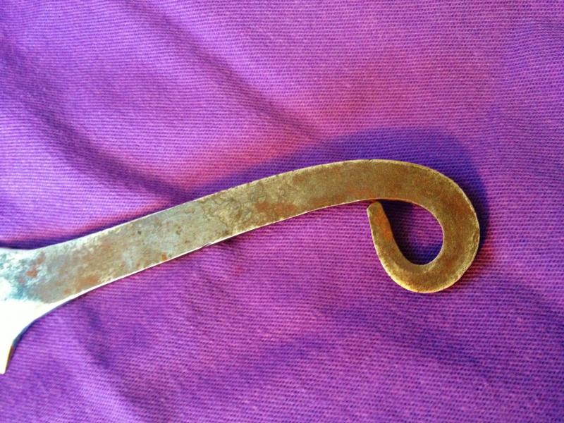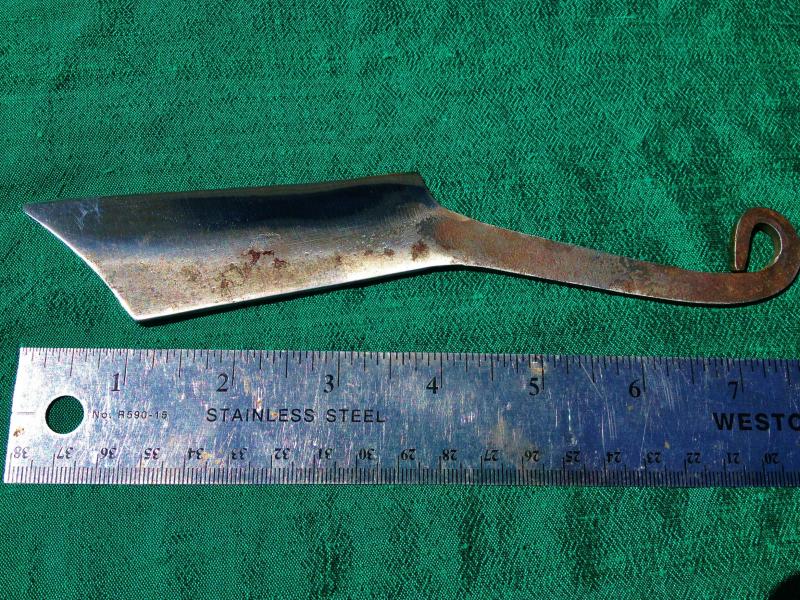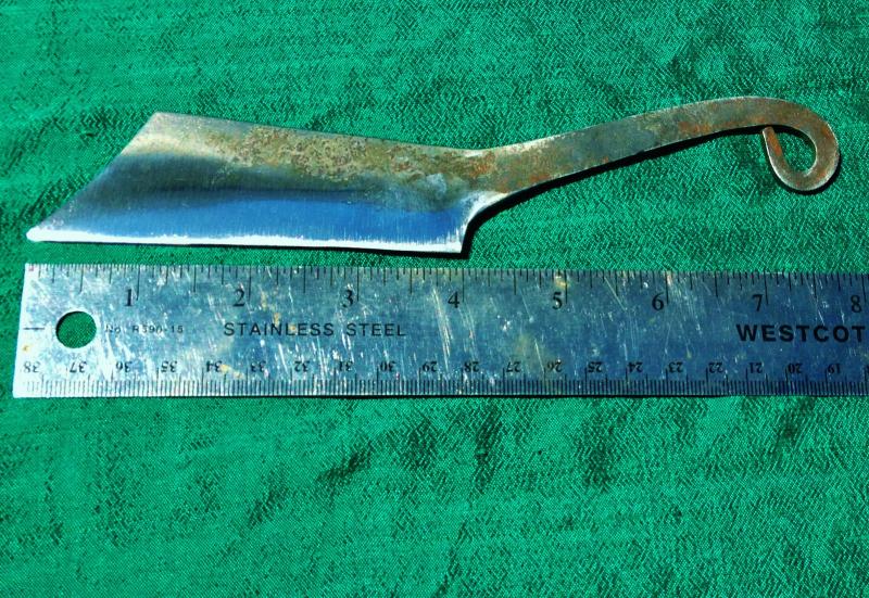 This razor knife shown was inspired off by the HBO movie series "Rome". It is made of 1085 high carbon steel and hand forged in our shop. It is RAZOR SHARP! The edge is ground to a razor sharp edge, and the rest is left with the ruff, hand forged texture, ending with an easy to grip curled handle. The knife itself is about 8 inches long, with the blade being about half that, 4 inches long. This is a really sweet razor and would look great in any re enactors camp, especially when you can use it!